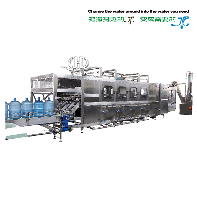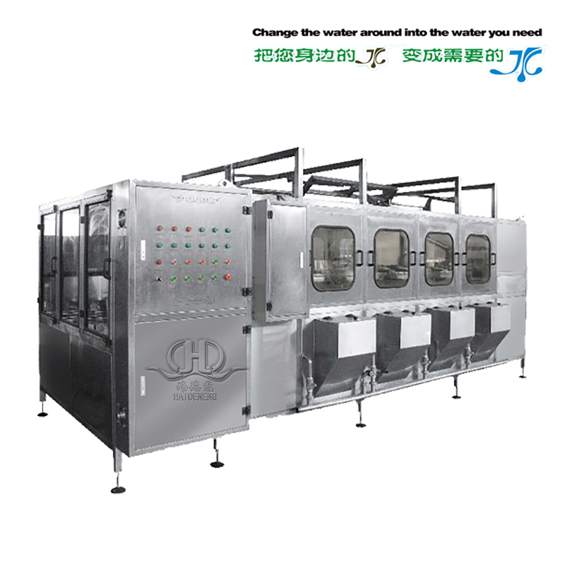 空桶由輸送帶穩定的輸入拔蓋機。拔蓋機用來拔掉蓋子,蓋子經過清洗和消毒以后可以再利用。隨后桶進入外刷桶機進行全方位的刷洗。經過全面的外部清洗以后,瓶子進入沖洗,灌裝,壓蓋機組,由水處理系統提供純凈水用于桶的沖洗和灌裝。壓蓋完成以后,瓶裝水通過輸送帶進入熱收縮機。在熱收縮機內完成瓶蓋收縮膜包裝。整個生產過程由PLC控制自動運行。控制面板可以很直觀的監測到設備每個部分的工作狀態,易于操作。